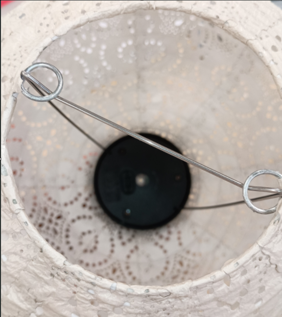3.Öffne vorsichtig den Lampenschirm in Form. Setze die Schultern der Metallstütze in die Metallösen am Öffnung der Laterne ein: